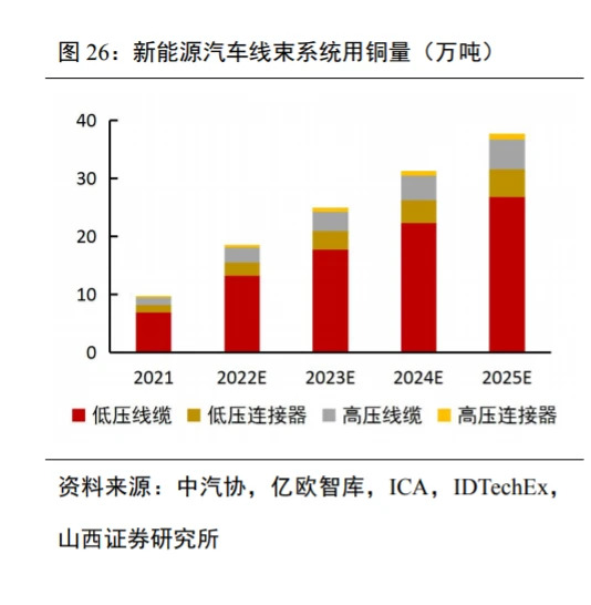 根据中汽协与亿欧智库数据,我国2021-2025年新能源汽车销量分别为352万辆、670 万辆、900 万辆、1130 万辆、1359 万辆。 根据 ICA 数据,传统汽车内燃机(ICE)用铜 23kg,混合电动汽车(HEV)用铜 40kg,插电混合电动汽车(PHEV)用铜 60kg,纯电动汽车(BEV)用铜 83kg,混合电动公交车(Ebus HEV)用铜 89kg,纯电动公交车(Ebus BEV)根据电池容量大小用铜量位于224-369kg 区间;我们采用 BEV 单车用铜量 83kg 进 行测算。 根据 IDTechEx 数据,新能源汽车用铜量中,电池占比48%,电机占比12%,高压线束占比6%,低压线束占比28%,其他占比6%;经测算,每辆新能源汽车低压线束用铜量为23.24kg,高压线束用铜量为4.98kg。 低压线束系统中,低压线缆(一般采用无氧铜丝)用铜量占比约85%,低压连接器(一般采用紫铜合金带材)用铜量占比约15%;高压线束系统中,高压线缆(一般采用退火纯铜)用铜量占比约75%,高压连接器(一般采用黄铜、磷青铜、铍青铜等铜合金)用铜量占比约15%;经测算,单车低压线缆用铜量约19.75kg,单车低压连接器用铜量约3.49kg,单车高压线缆用铜量约3.74kg,单车高压连接器用铜量约0.75kg。 根据百川盈孚数据,无氧铜丝软线、紫铜带、紫铜棒、磷铜合金、铍铜合金的2021年均价分别为6.94万元/吨、7.62万元/吨、7.43万元吨、7.21万元/吨、16.68万元/吨。 经测算,我国高压连接器用高端铜合金2022-2025年需求量为0.50/0.68/0.85/1.02万吨,2022-2025年我国新能源汽车线束系统用铜市场规模分别为137/184/230/277亿元。